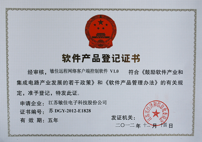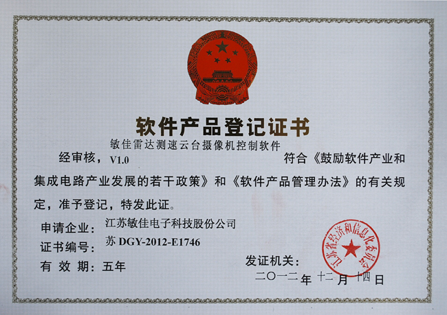 2012年12月14號,我公司獲得了由江蘇省經(jīng)濟和信息化委員會頒發(fā)的軟件產(chǎn)品登記證書。此次,又有二個產(chǎn)品經(jīng)審核符合《鼓勵軟件產(chǎn)業(yè)和集成電路產(chǎn)業(yè)發(fā)展的若干政策》和《軟件產(chǎn)品管理辦法》的有關(guān)規(guī)定,被認定為軟件產(chǎn)品,其中包括:敏佳雷達測試云臺攝像機控制軟件V1.0、敏佳遠程網(wǎng)絡(luò)客戶端控制軟件V1.0。